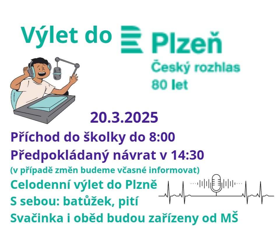 Plzeň Český rozhlas – výlet – 20.3.202517. 3. 202517. 3. 2025 Ve čtvrtek se vydáme navštívit rozhlas. Předpokládaný příjezd zpět do školky ve 14:30 (pojedeme z Plzně přes Blovice).